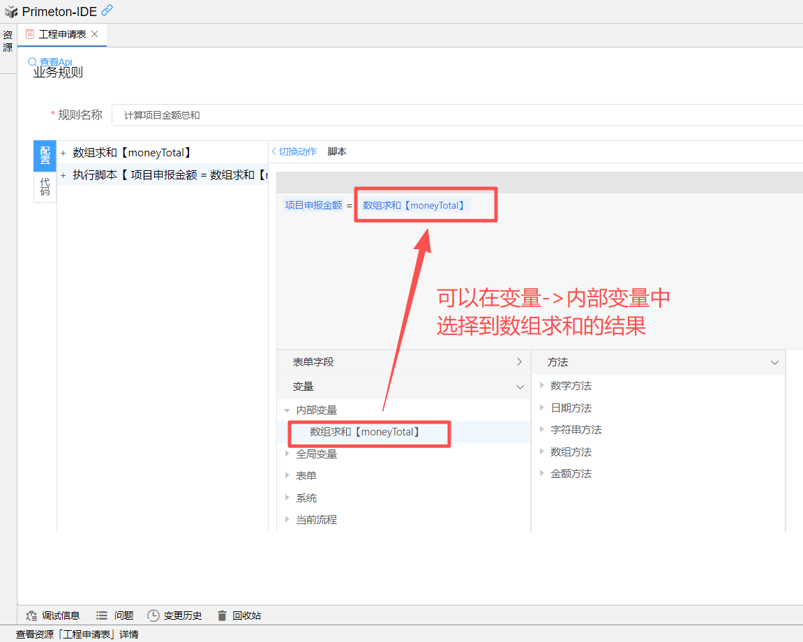 3.打开表单设置中业务规则,新建业务规则,输入名称-计算项目金额总和,在规则编辑器中根据下面步骤进行配置: