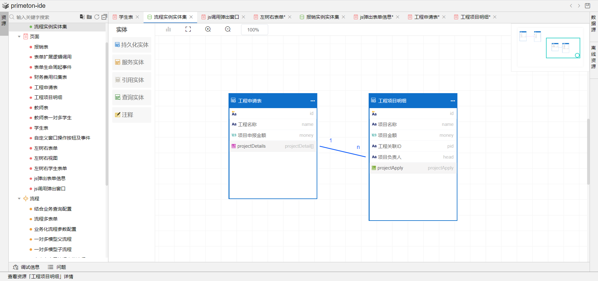 2.拖动子表格组件并绑定工程项目表,子表格绑定n端实体对象字段。