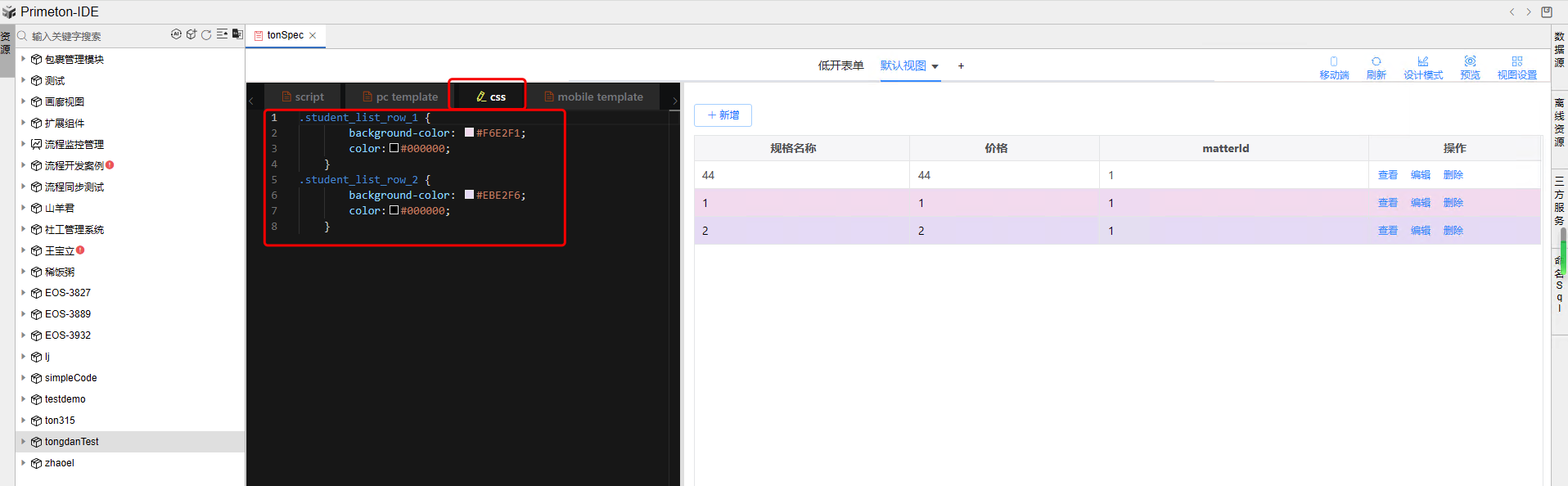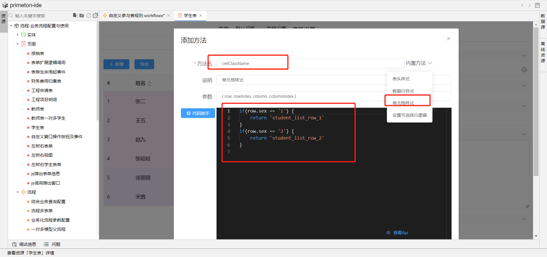 2.在高级设置中新建方法,选择右侧内置方法-单元格样式,根据自动生成的方法名与参数进行编辑js内容,判断如果性别为男,显示样式student_list_row_1,性别为女显示样式student_list_row_2。