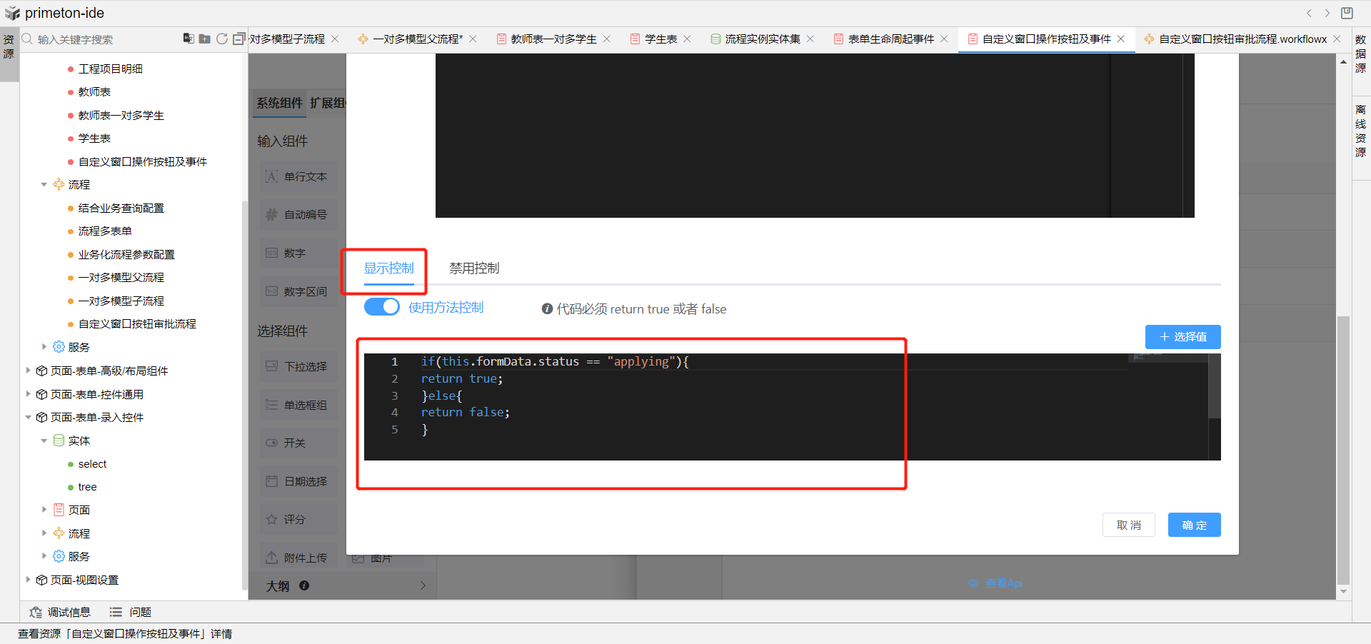3.在审批按钮的显示控制区域进行判断,如果打开的表单是审批中,则返回true显示审批按钮,否则返回false,不显示审批按钮。