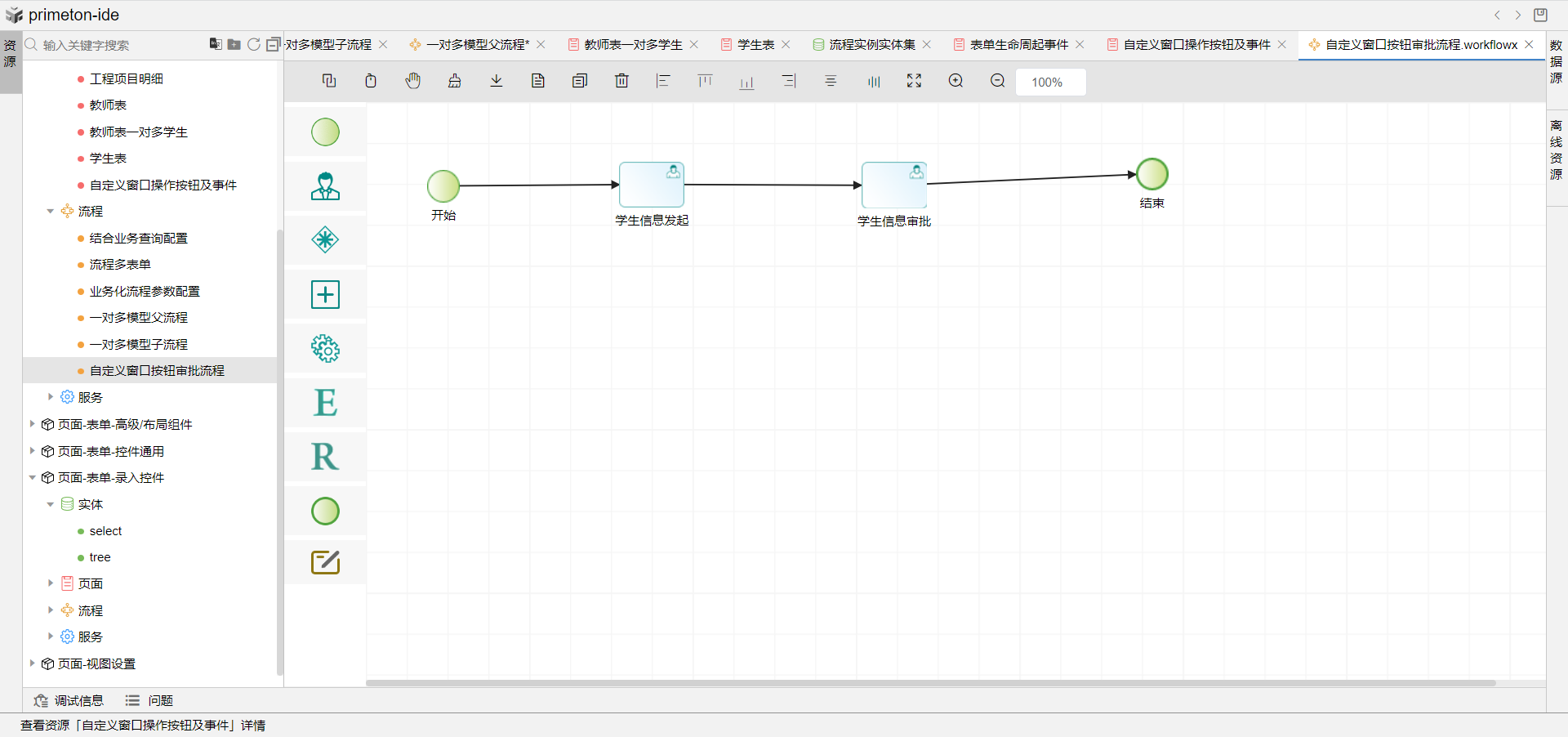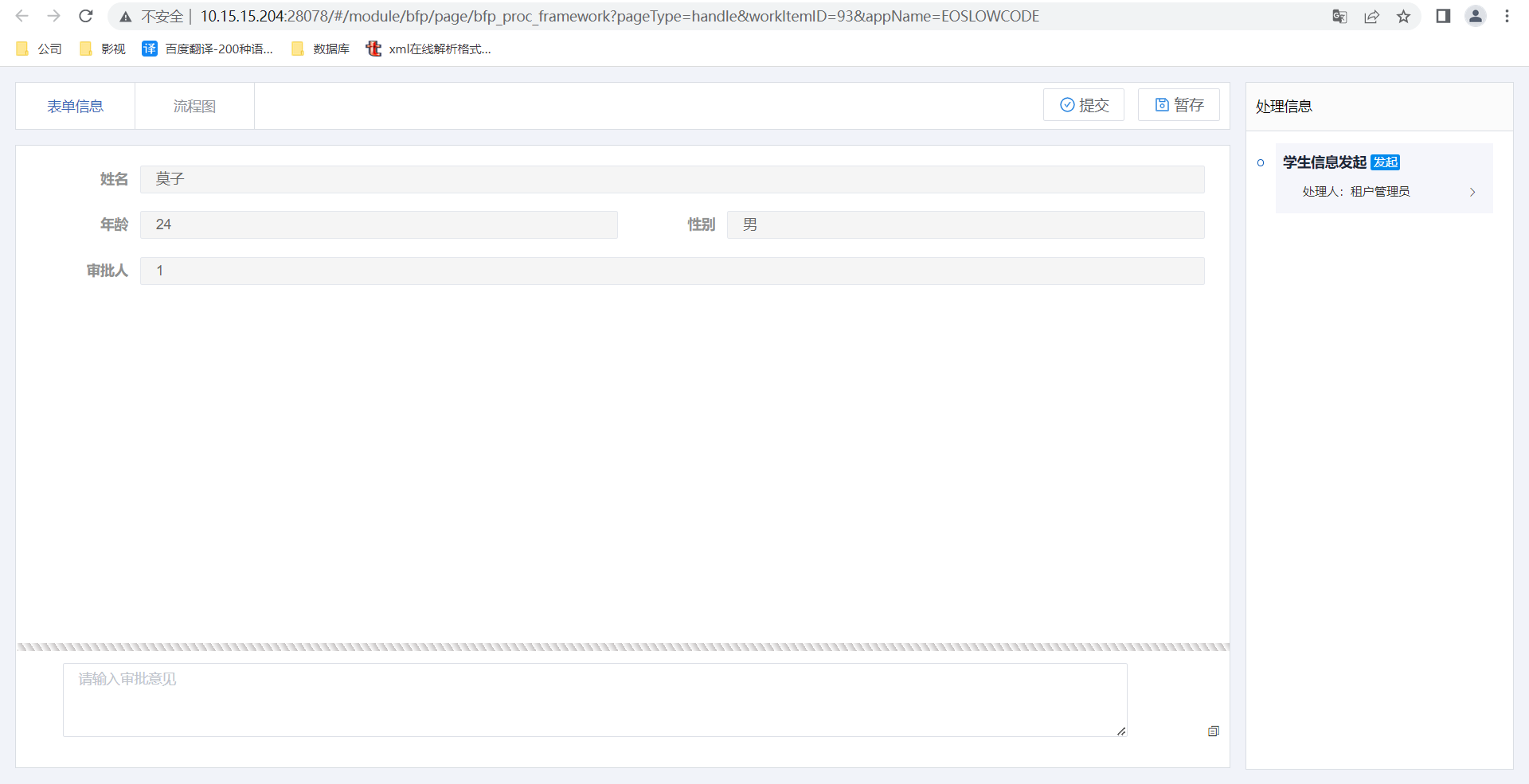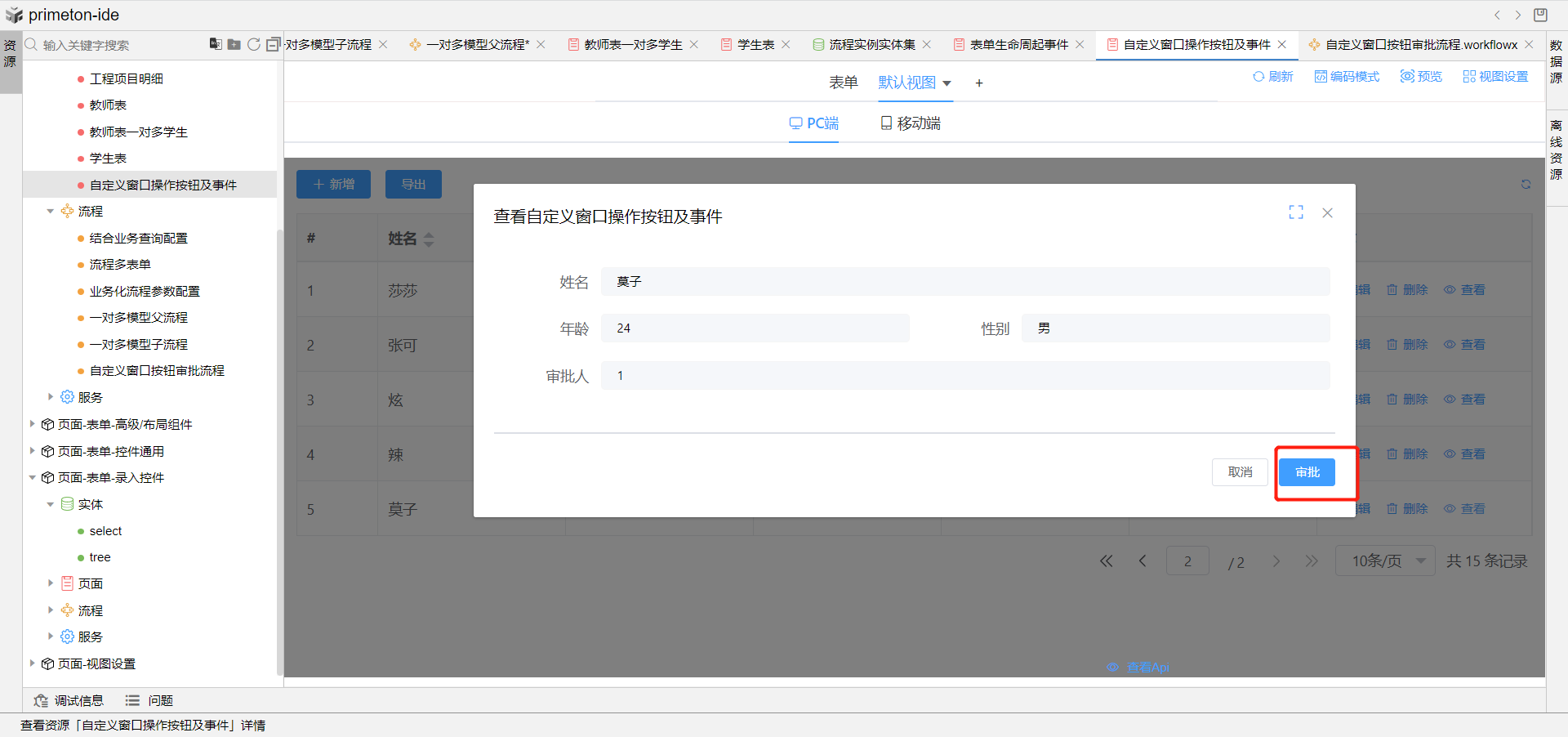 4.根据当前表单创建一条审批流程,发起审批任务,即可在视图中点击查看后,根据弹窗的审批按钮去审批任务。