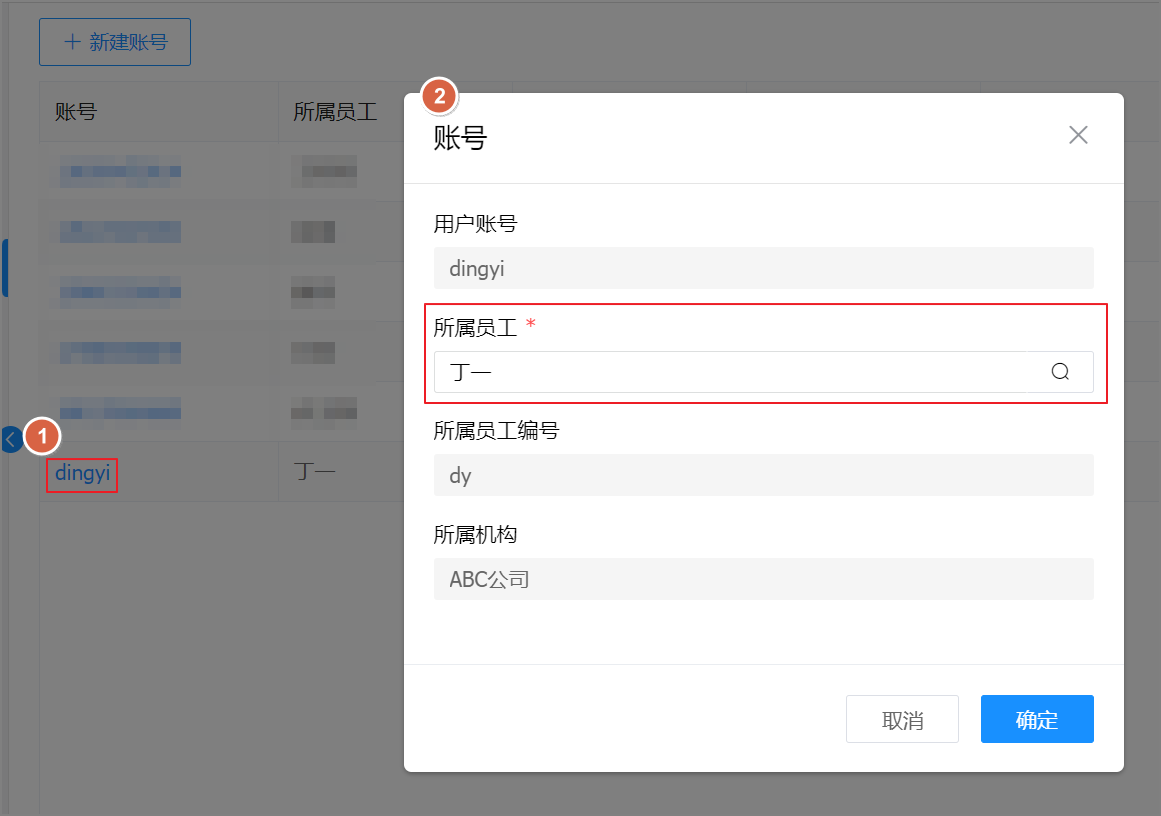 在账号列表中,单击账号,可以修改账号的所属员工。