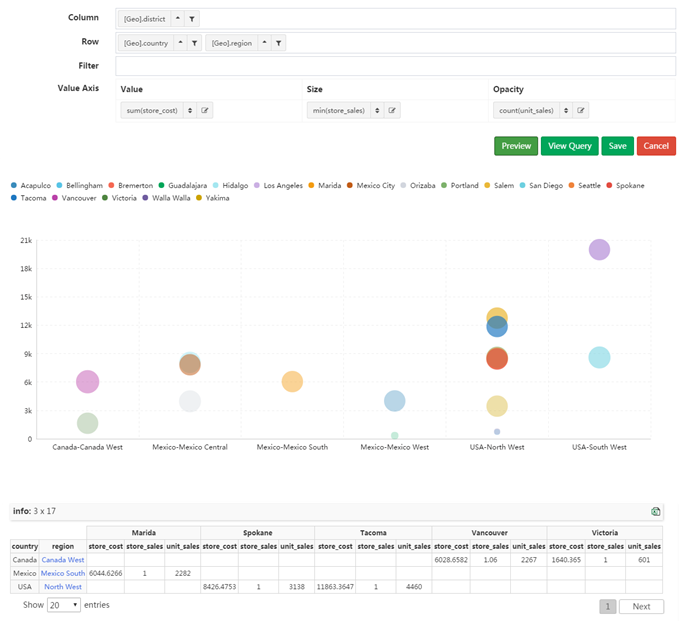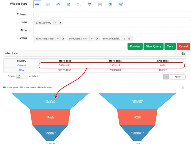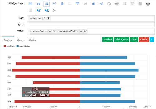 一般情况下一个漏斗需要显示如 展示->点击->提交->付款, 一连串不同度量的数值, 在交叉表里面为值轴放置的多个列 行里面的值会按大小自动排序之后形成漏斗 所以漏斗图一行一个漏斗, 下面的 Demo 没有实际意义,仅仅作为演示说明