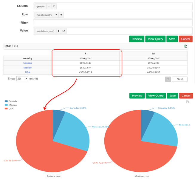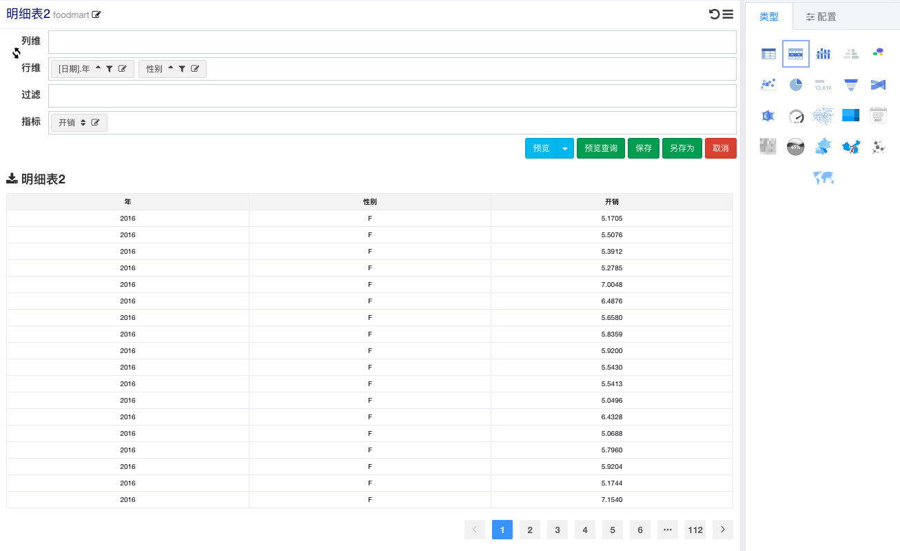 如下图所示,明细表和交叉表在同时限定维度年与性别的情况下,明细表会返回大量没有经过聚合的重复数据,交叉表返回的则是对两个维度进行聚合之后的结果集。