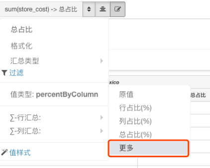 当我们有了原始的交叉表表格之后,可以对表格上的数据(视图数据)进行二次加工,快速值类型转换计算行列占比、总占比等