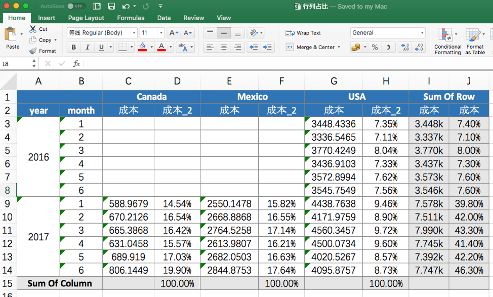 下图 USA 的列占比分成了按销售年份分成了 2 组, 为了让结果更加直观, 提前开启了列汇总功能, 显示 200%