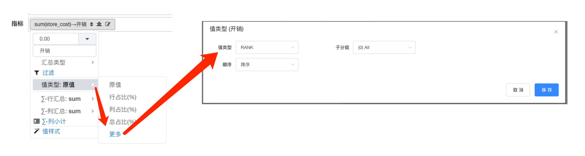 在原始值基础之上, 只需简单对指标进行值类型设置之后原始数值将进行相应换算成占比, 同比, 环比等;