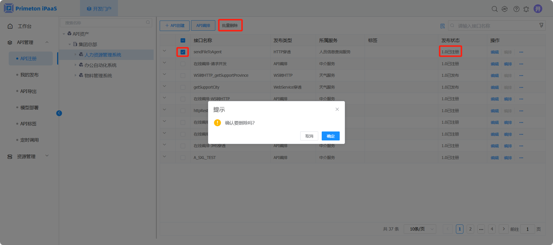 1. 在“API注册”界面,选择左侧组织树中API所属节点,选中需要删除的API接口,点击“批量删除”按钮,弹出删除确认界面 (已发布接口需取消发布并删除发布记录后才能删除,待发布的接口需在我的发布菜单栏删除发布记录后才能删除)。