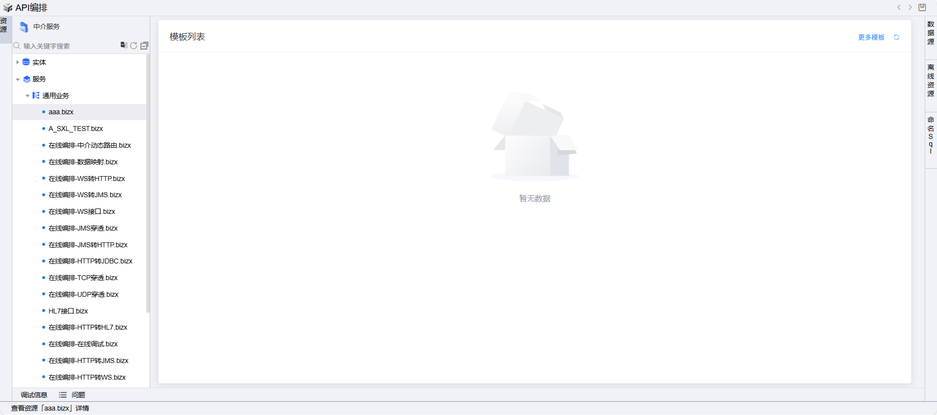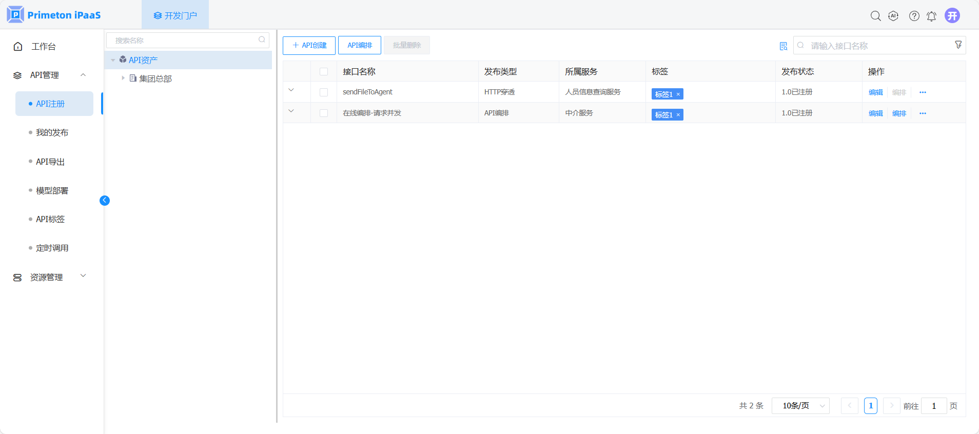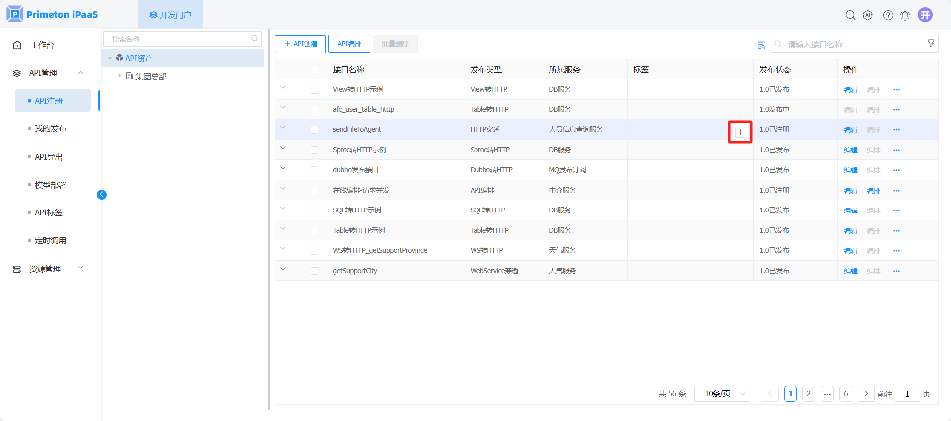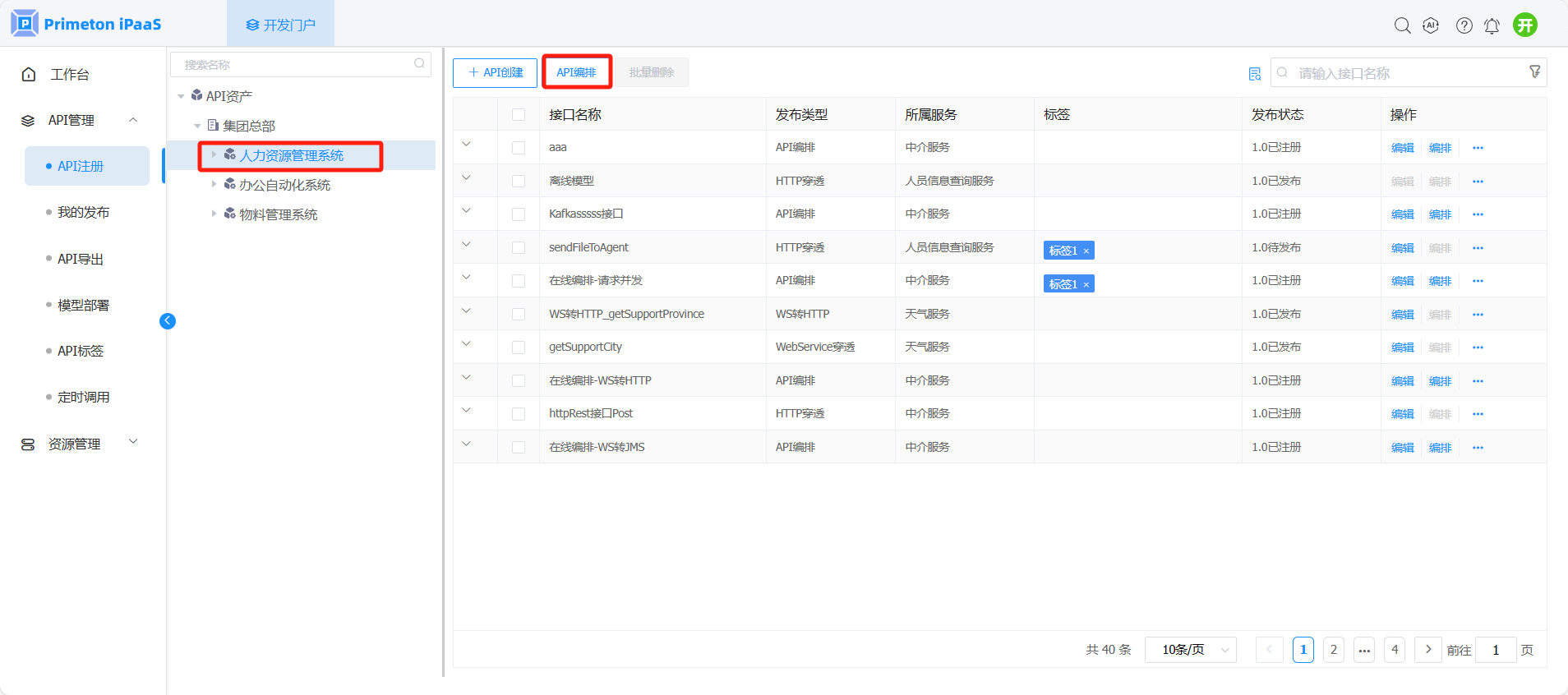 1. “API注册”页面,选择左侧组织树中资源节点,右侧API列表页面点击“API编排”按钮。
