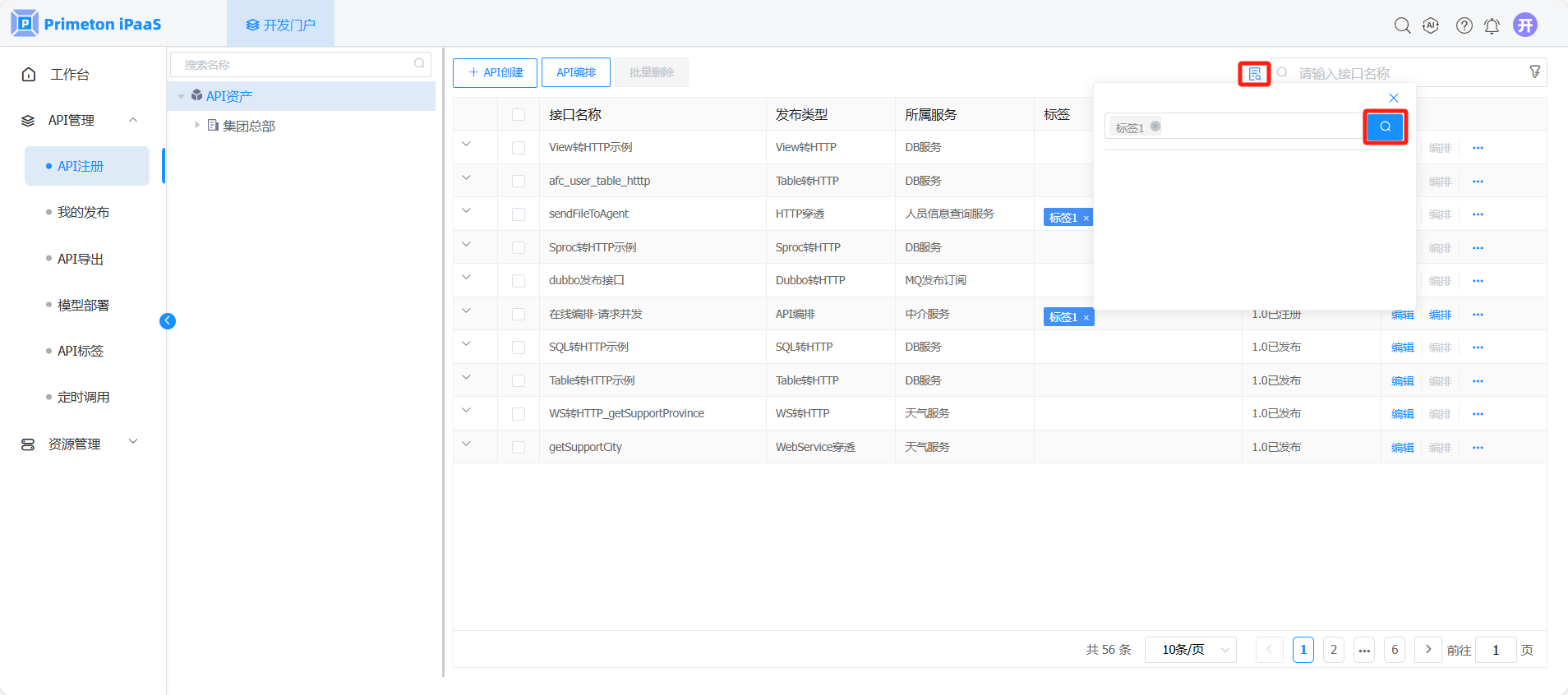 1. 在“API注册”界面,选择左侧组织树中API所属节点,点击标签查询按钮,选择标签,点击“搜索”图标,进行接口查询。