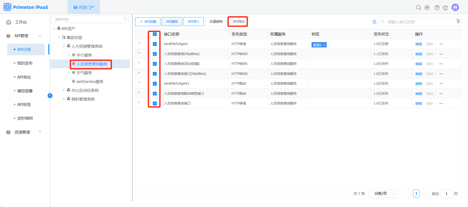 1. 在“API注册”界面,选择左侧组织树中API所属服务节点,勾选需要导出的API接口,点击“API导出”按钮,即可导出API接口文件。