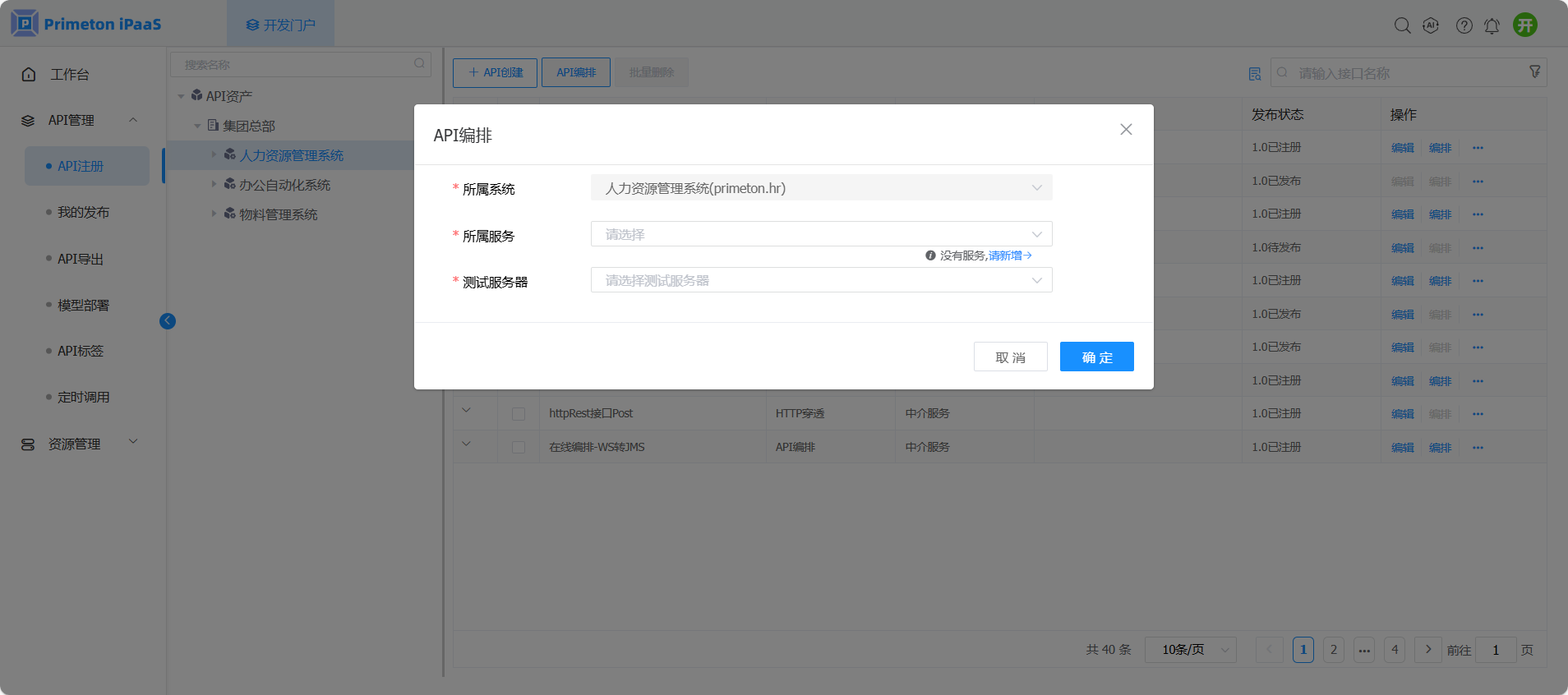 2. 若左侧节点API编排的“所属系统”、“所属服务”、“测试服务器”信息未明确配置,则弹出API编排属性配置界面,参考字段说明填写数据,点击“确定”按钮进行保存并跳转至API编排页面。