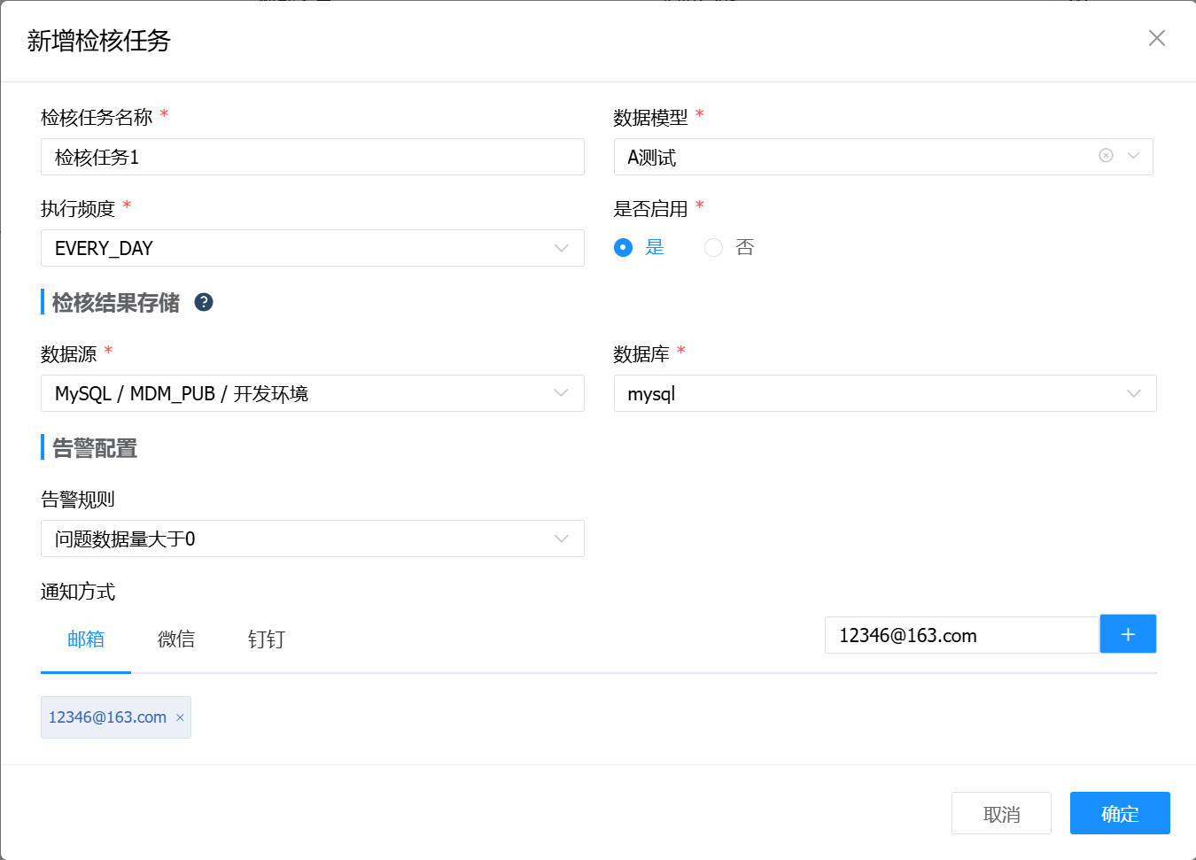 是否启用 | 检核任务是否启用,如果启用,并设置好执行频度,则会按照频度自动执行。 |