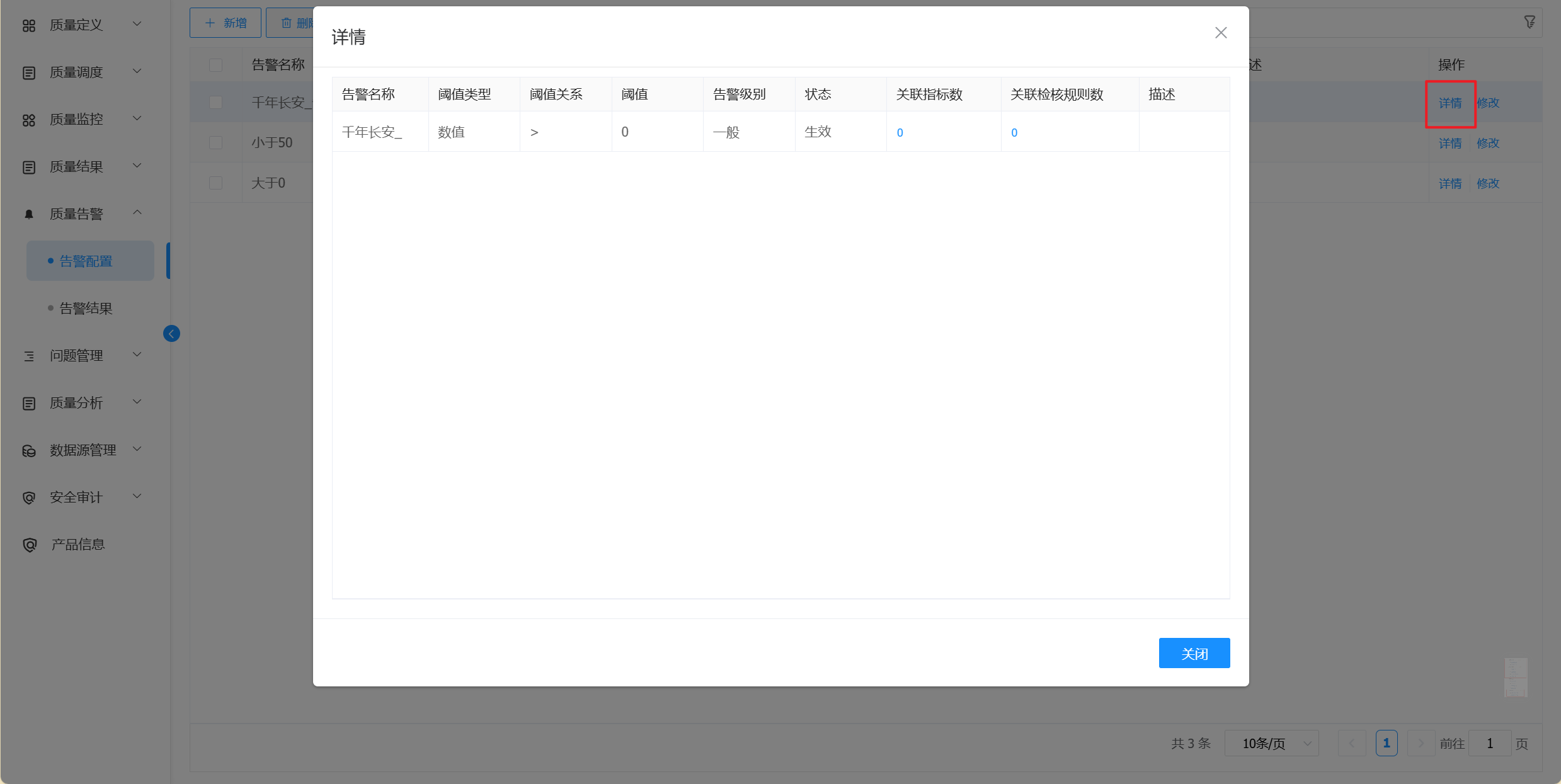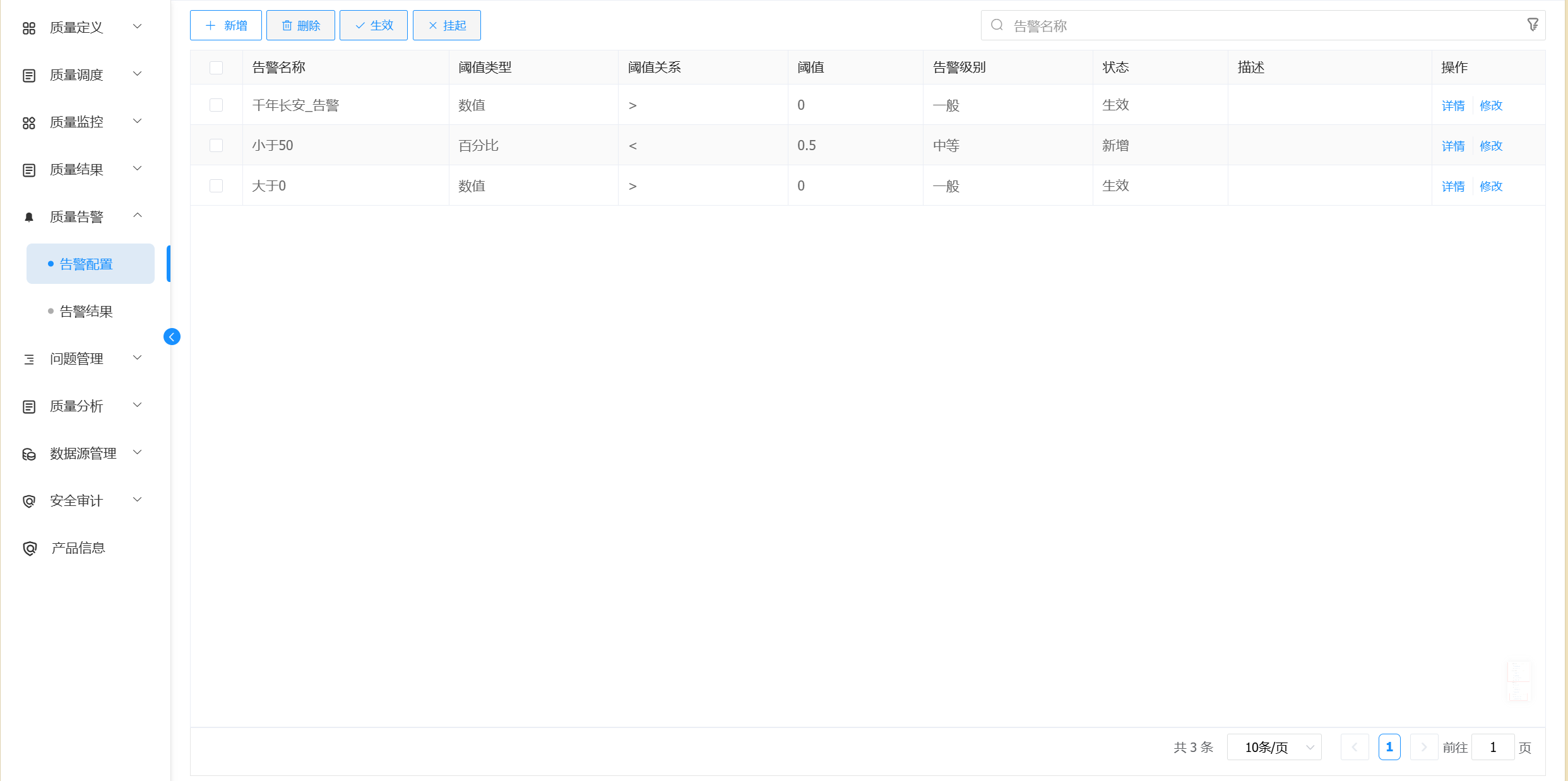告警规则 | 当检核结果问题数据满足告警规则时,触发告警通知功能 |