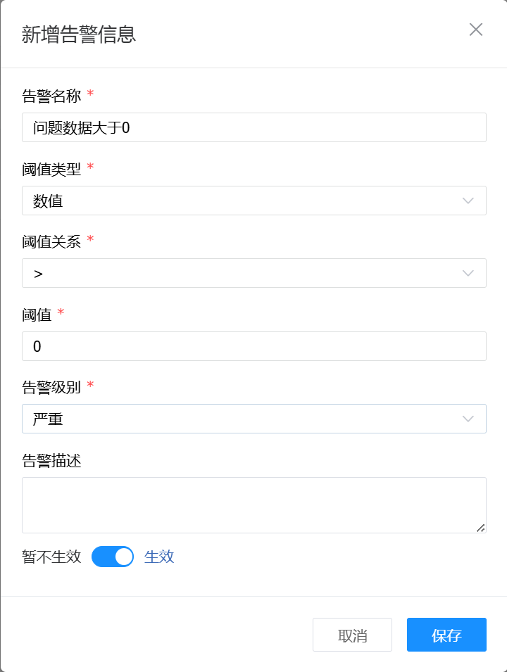 生效开关 | 当选择生效时,告警功能才正常启用 |