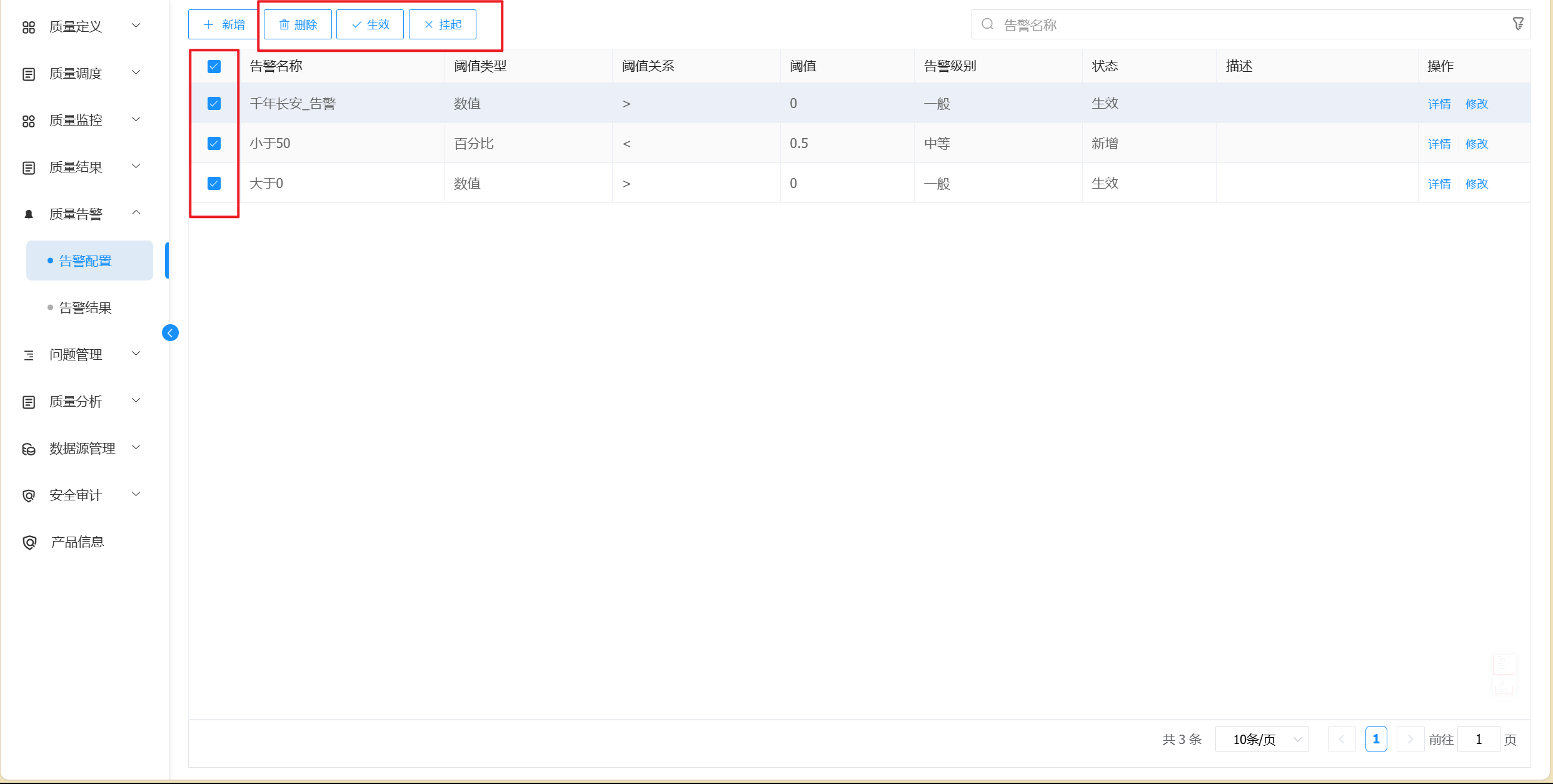 - 批量生效:勾选左侧多选框,选择生效,对多个告警配置进行批量启用生效