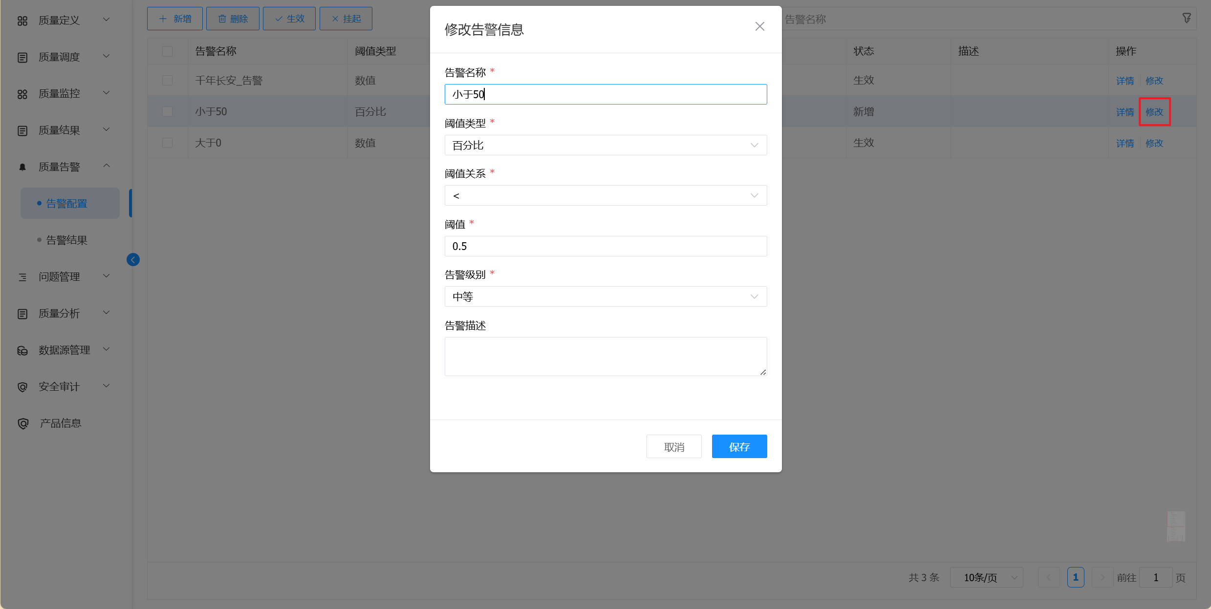 新增检核任务时如果需要配置告警规则。告警规则在【数据质量】→ 【质量告警】→ 【告警配置】中进行配置: