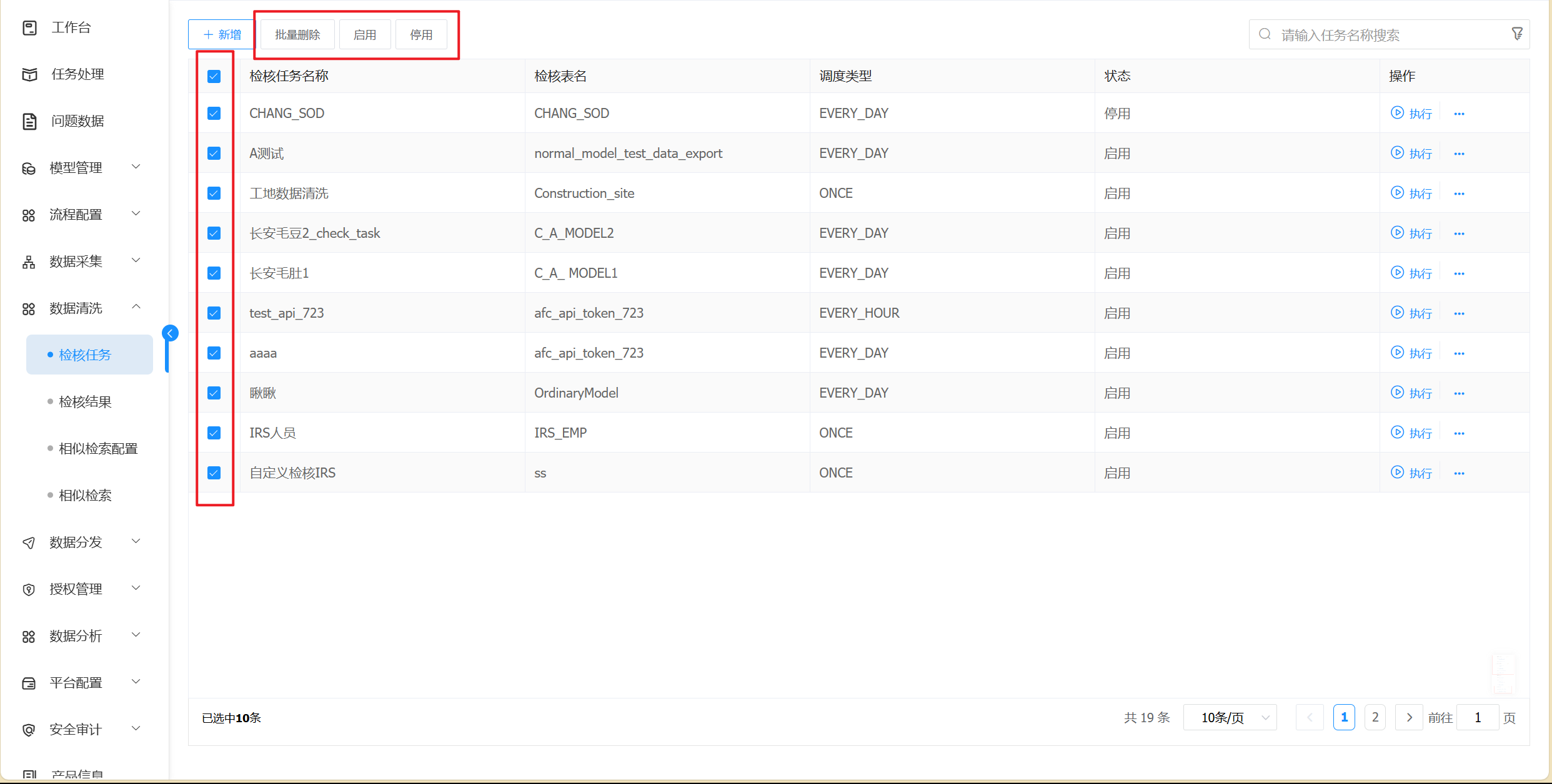 - 批量启用:勾选左侧多选框,选择启用,对多个检核任务进行批量启用生效