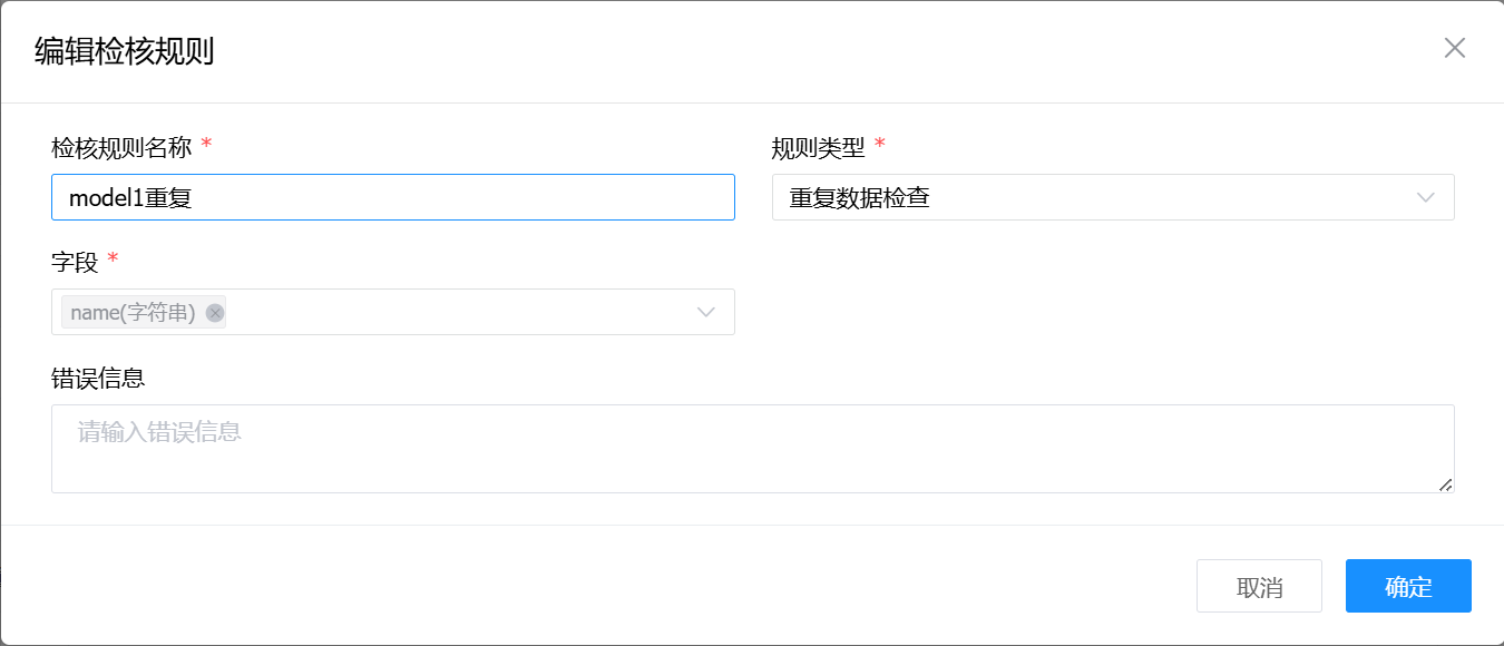 重复数据检查 | 检查目标字段的值是否存在重复的值,可以支持单个或多个字段。 |