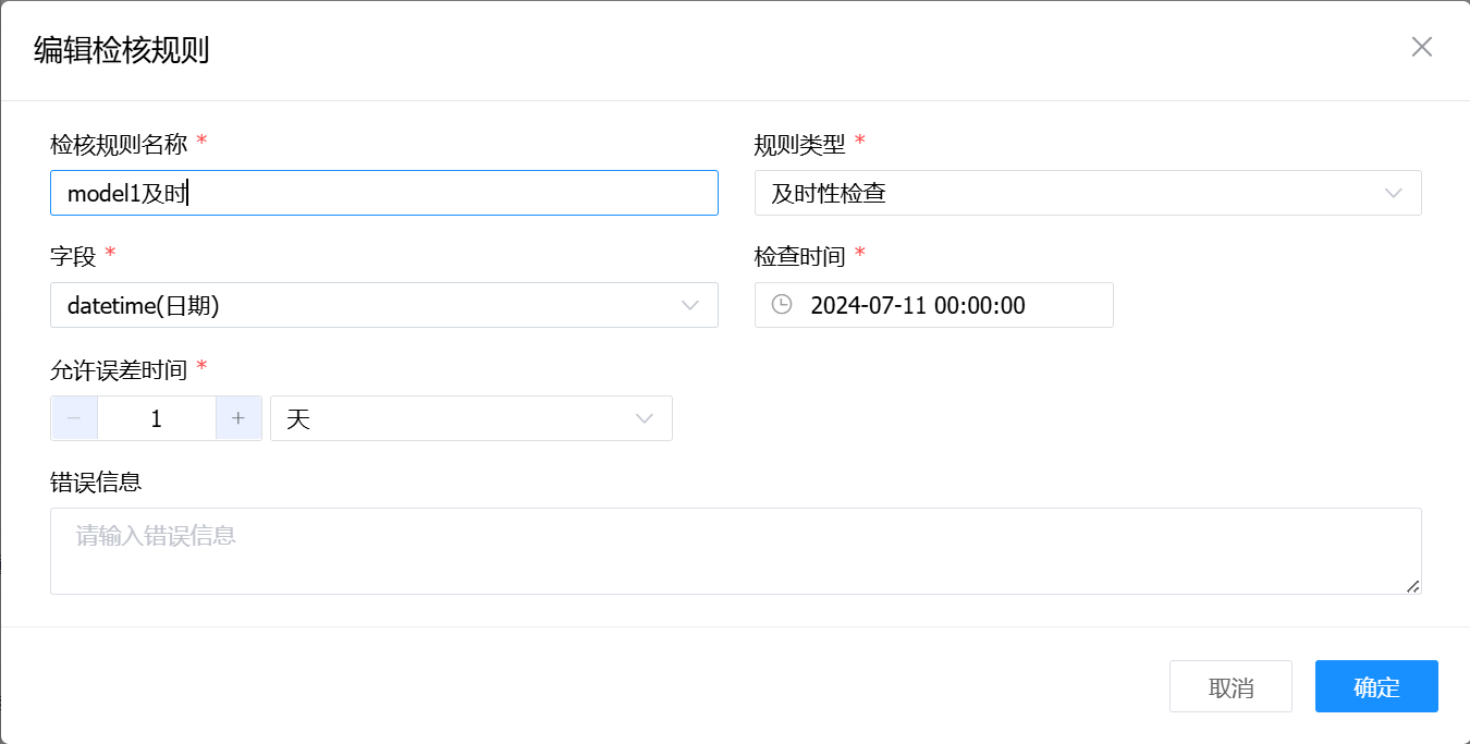 及时性检查 | 检查数据的及时性,需要指定日期时间类型的字段,并设置误差时间,误差时间单位支持天、小时、分钟。 |