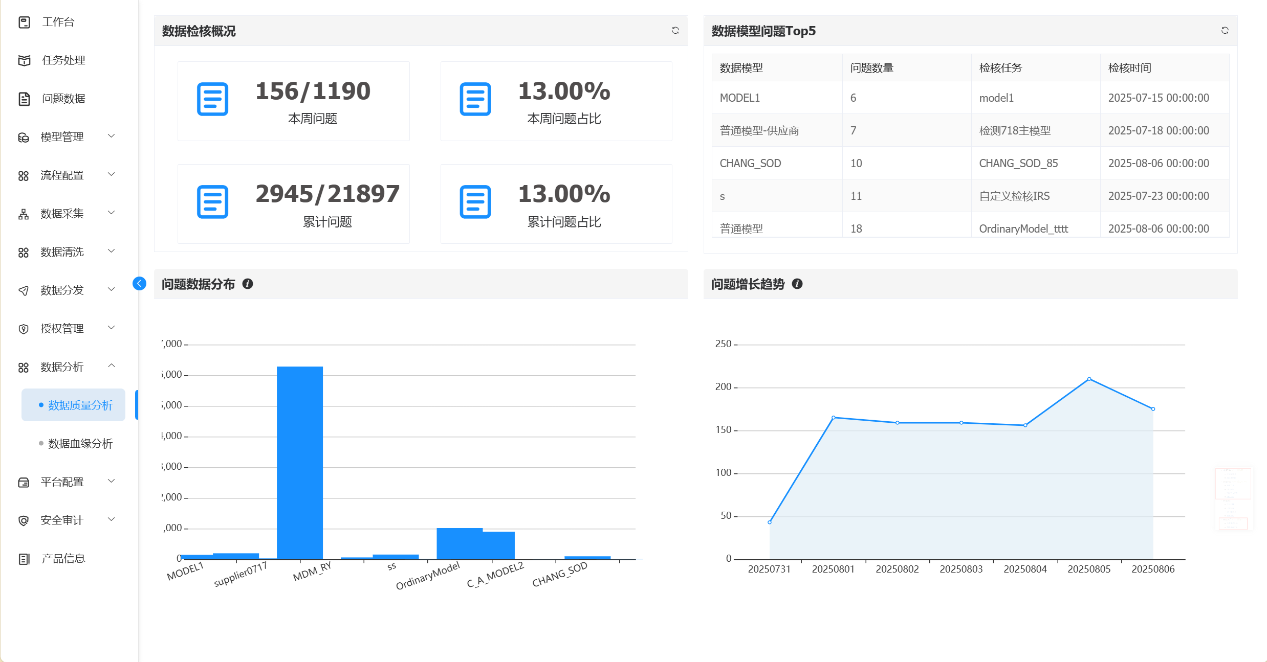 访问路径【主数据管理门户】→ 【数据分析】→【数据质量分析】进入数据质量分析页面。