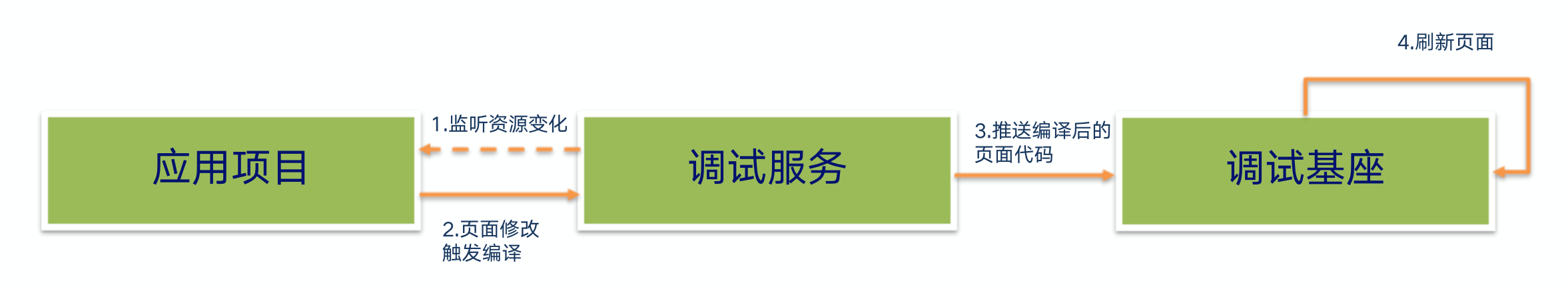 调试服务启动后,监听应用项目的资源变化,当发生页面代码修改时,触发调试服务的编译。调试服务将页面编译后,推送给调试基座,调试基座更新代码后,刷新页面。
