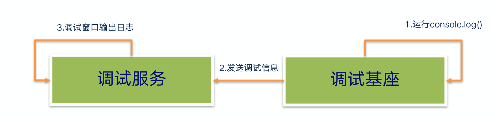 当调试基座运行到console.log代码时,会将日志发送给调试服务。调试服务在收到日志后,在调试控制台输出日志。