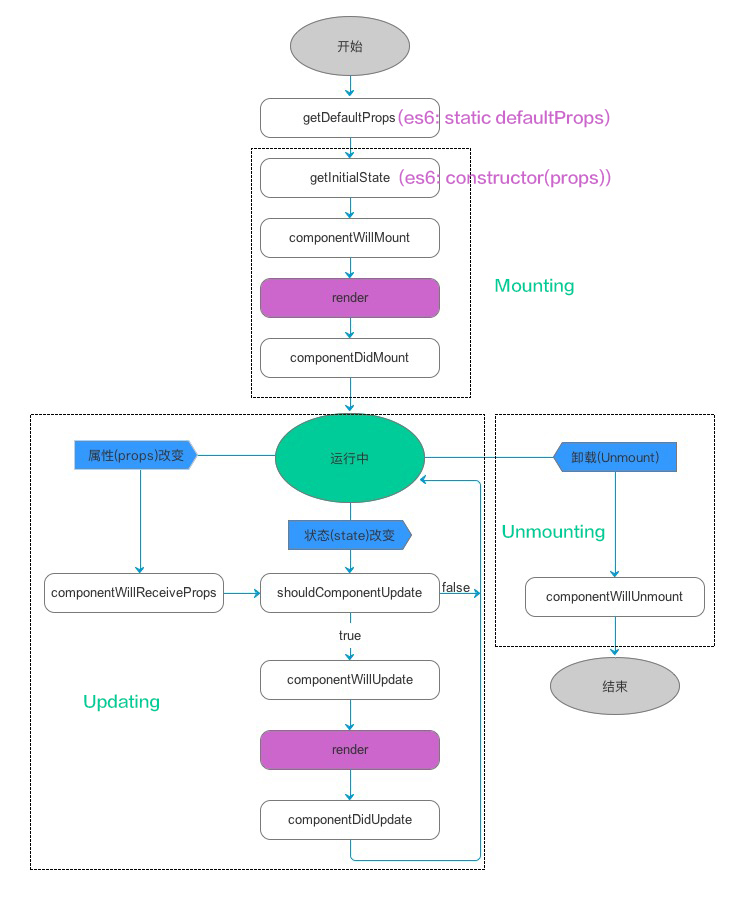 - componentWillUpdate(object nextProps, object nextState):与componentWillMount类似,参数为最新的props和state,不可以在该方法中更新state和props。