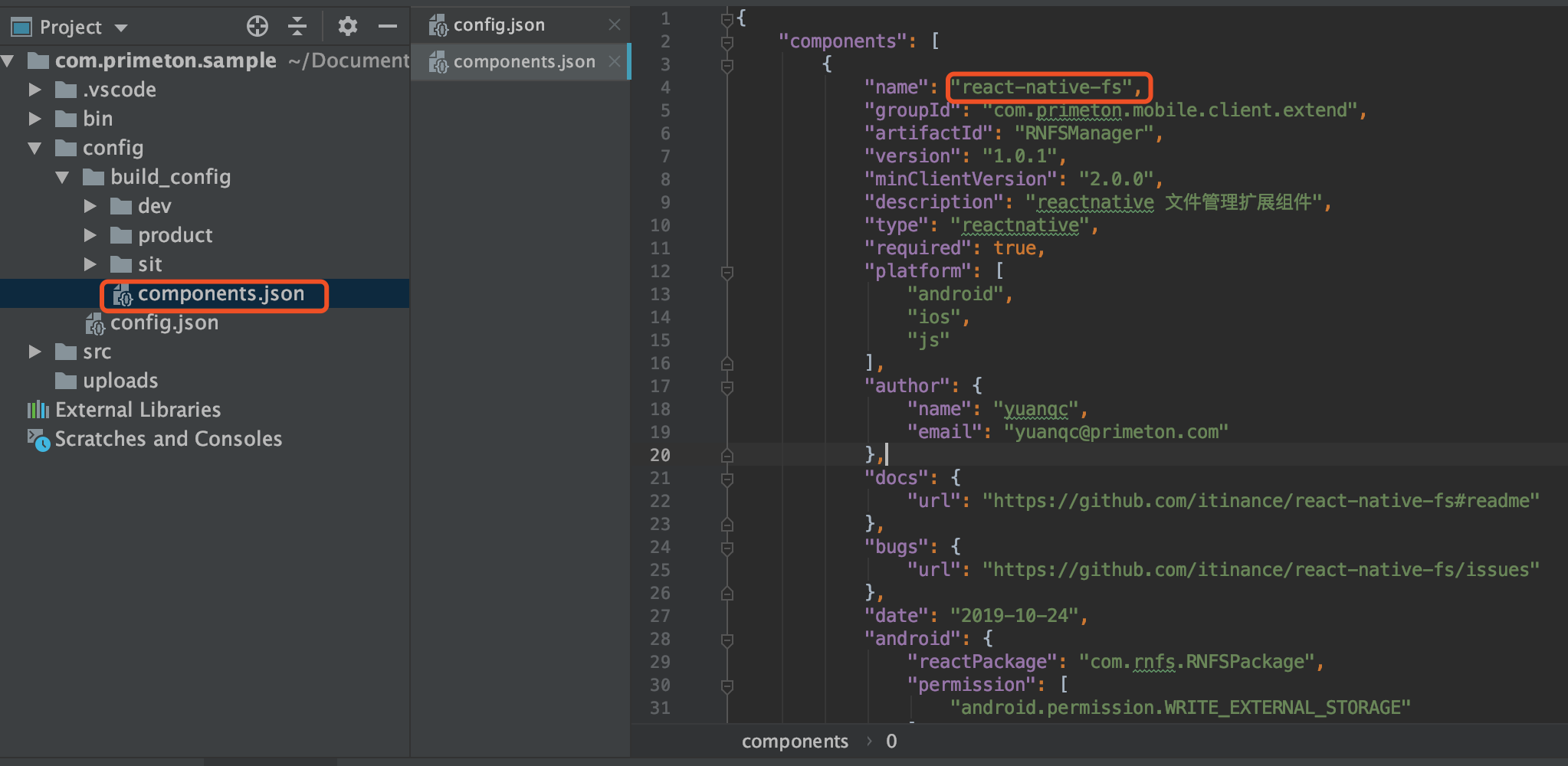 components.json中配置了项目导入哪些三方包以及对应的信息,在编译打包时 会读取该文件把对应三方库打包到项目中。如下图