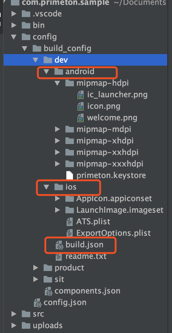 ios目录:存放打包配置页面iOS信息配置的图标,启动图。